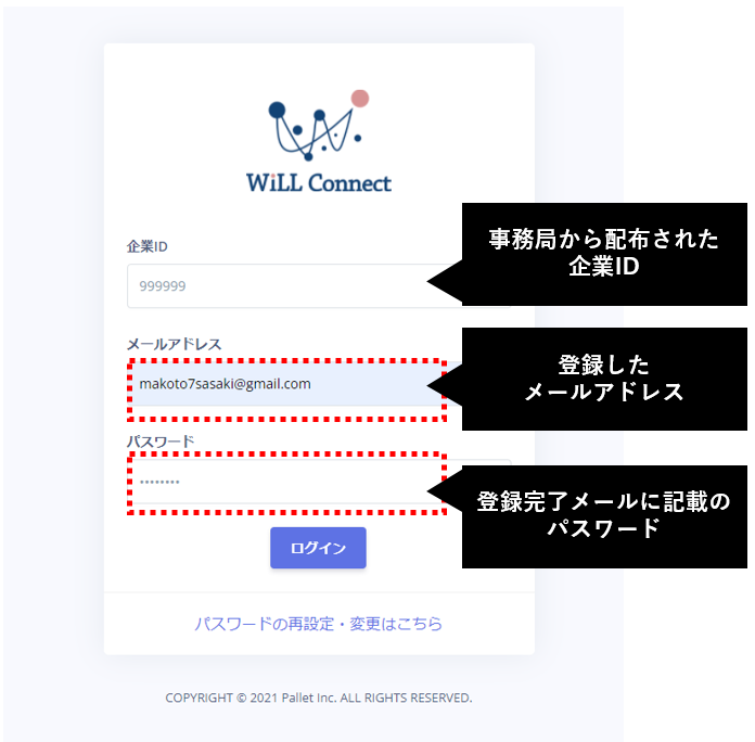 ※企業IDは上記WiLL Connectユーザー登録完了メール内に記載があります。