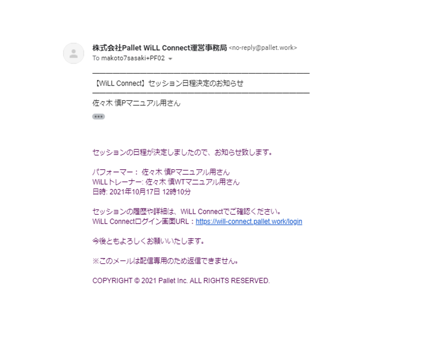 担当WiLLトレーナーが日程を入力すると、次のようなメールが送信されセッション日程が決定となります。