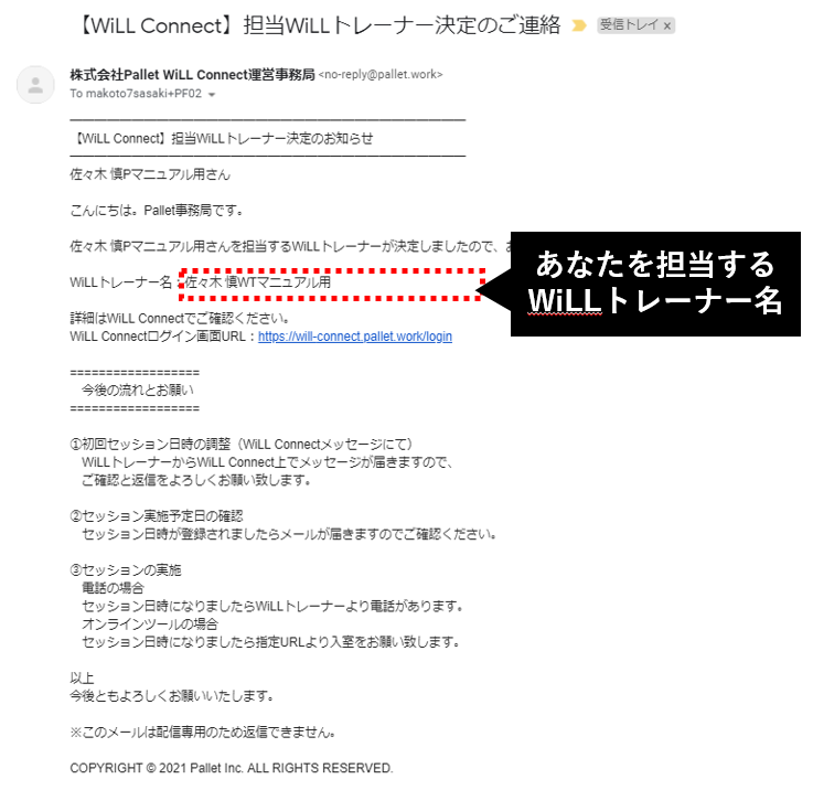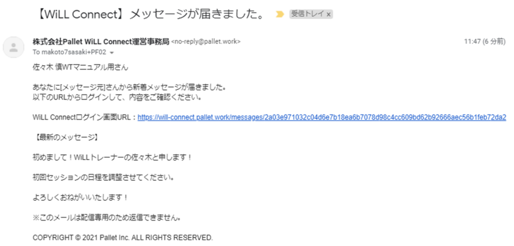 WiLLトレーナーとのマッチングが行われると以下のようなメールが届きます。