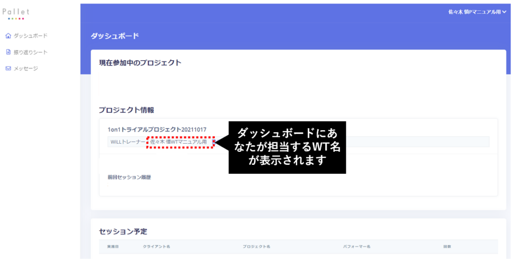 WiLL ConnectにログインするとマッチングされたWiLLトレーナー名が表示されています。
