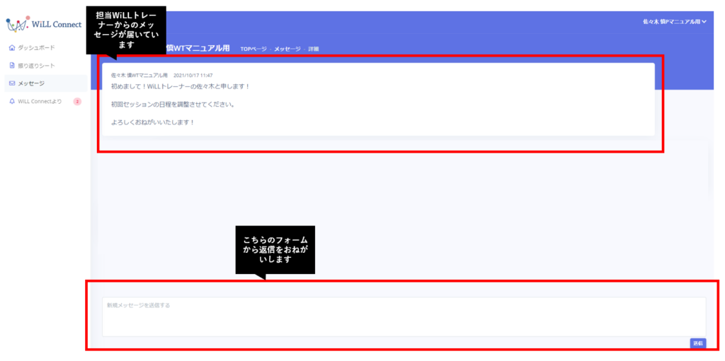 担当WiLL トレーナーからのメッセージを確認の上、WiLLトレーナーとWiLL Connect上でやり取りしていただき、初回セッション日程を確定してください